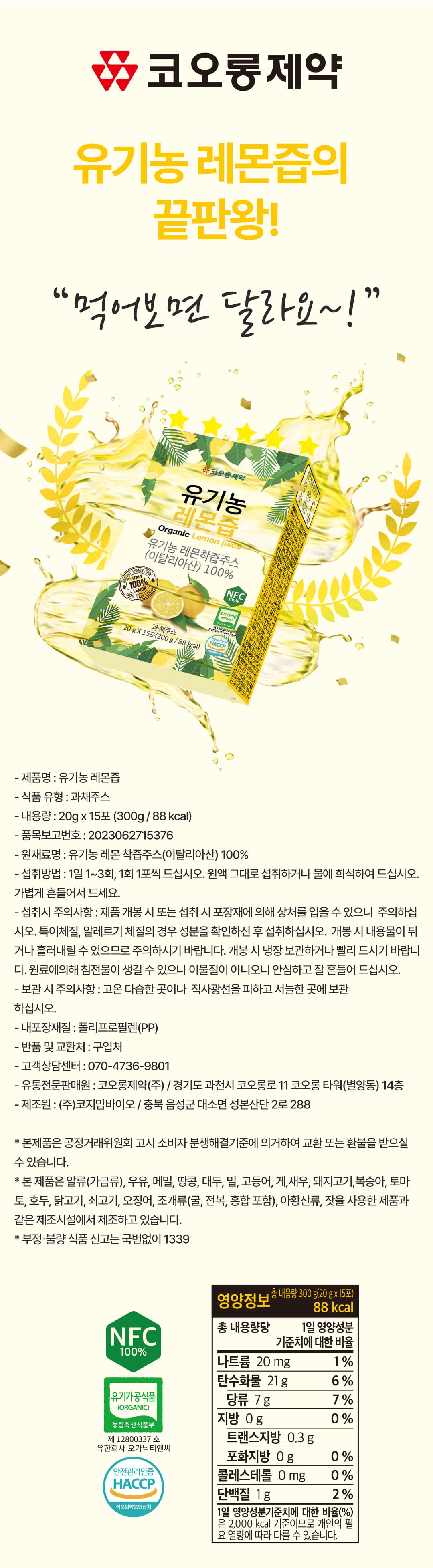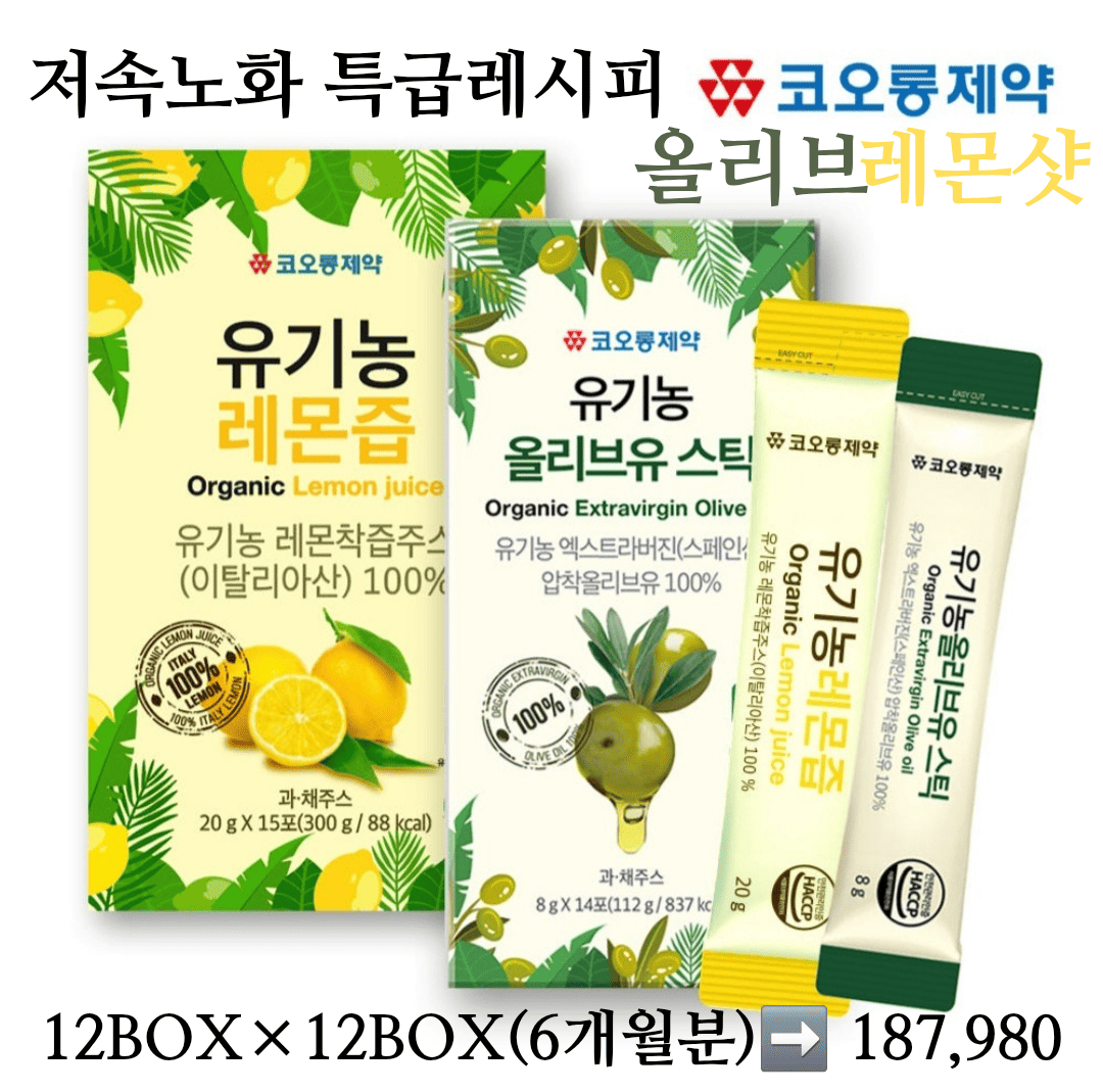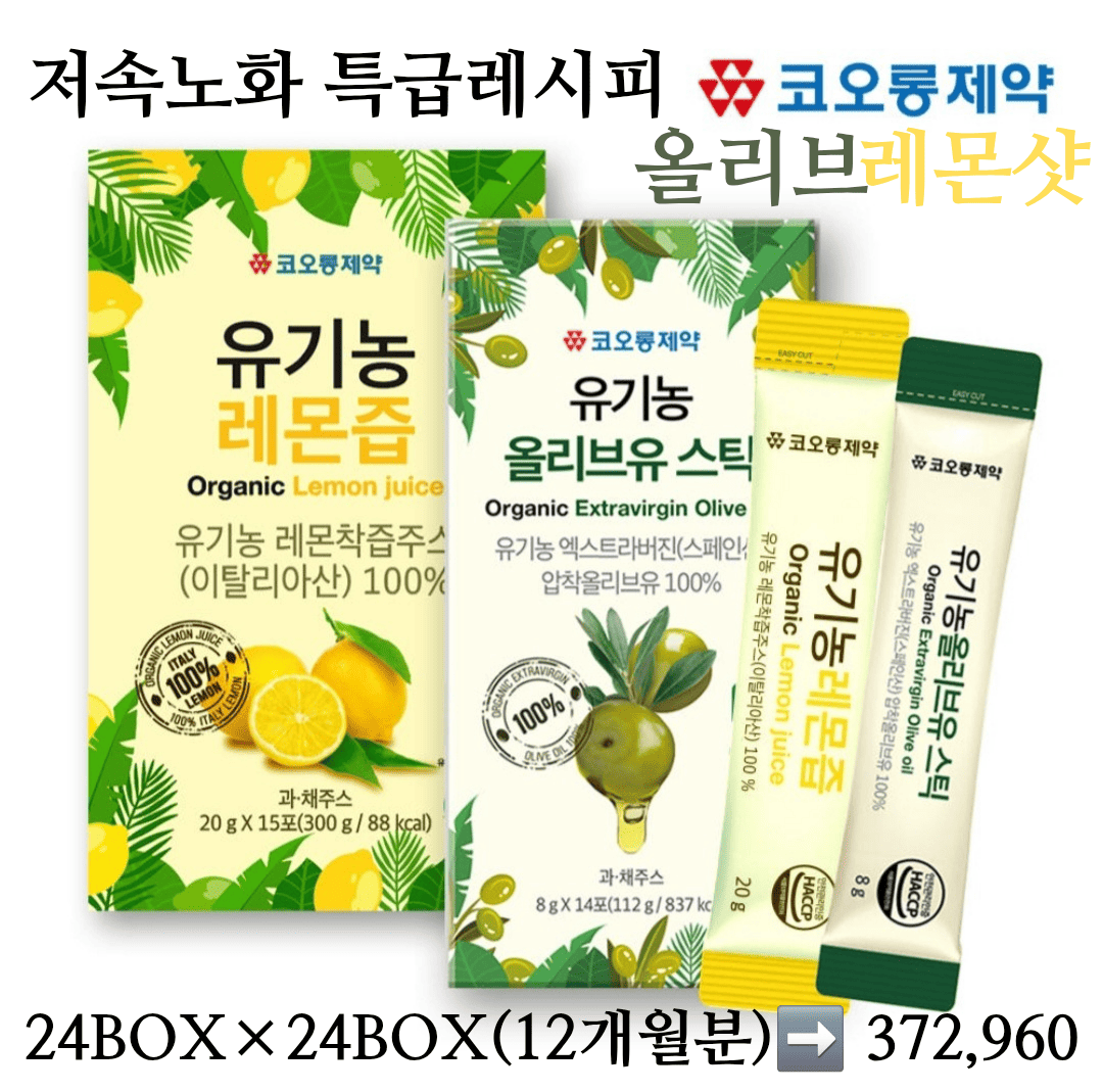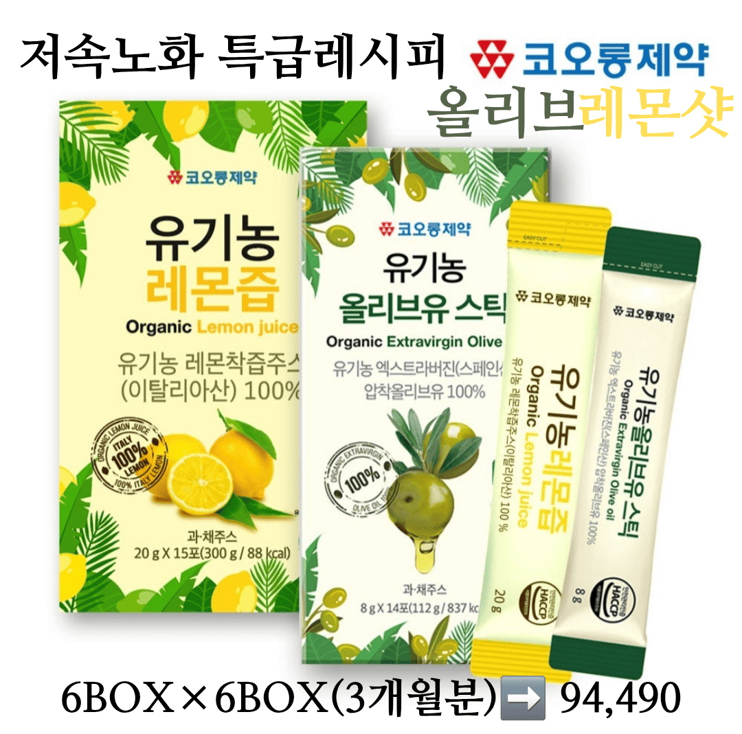 저속노화 초특급 레시피, 코오롱 "올레 유기농 100% 엑스트라버진 1등급 스페인산 올리브유" +"100%유기농 이탈리아산 레몬즙" 6BOX×6BOX(3개월분) >> 94,490