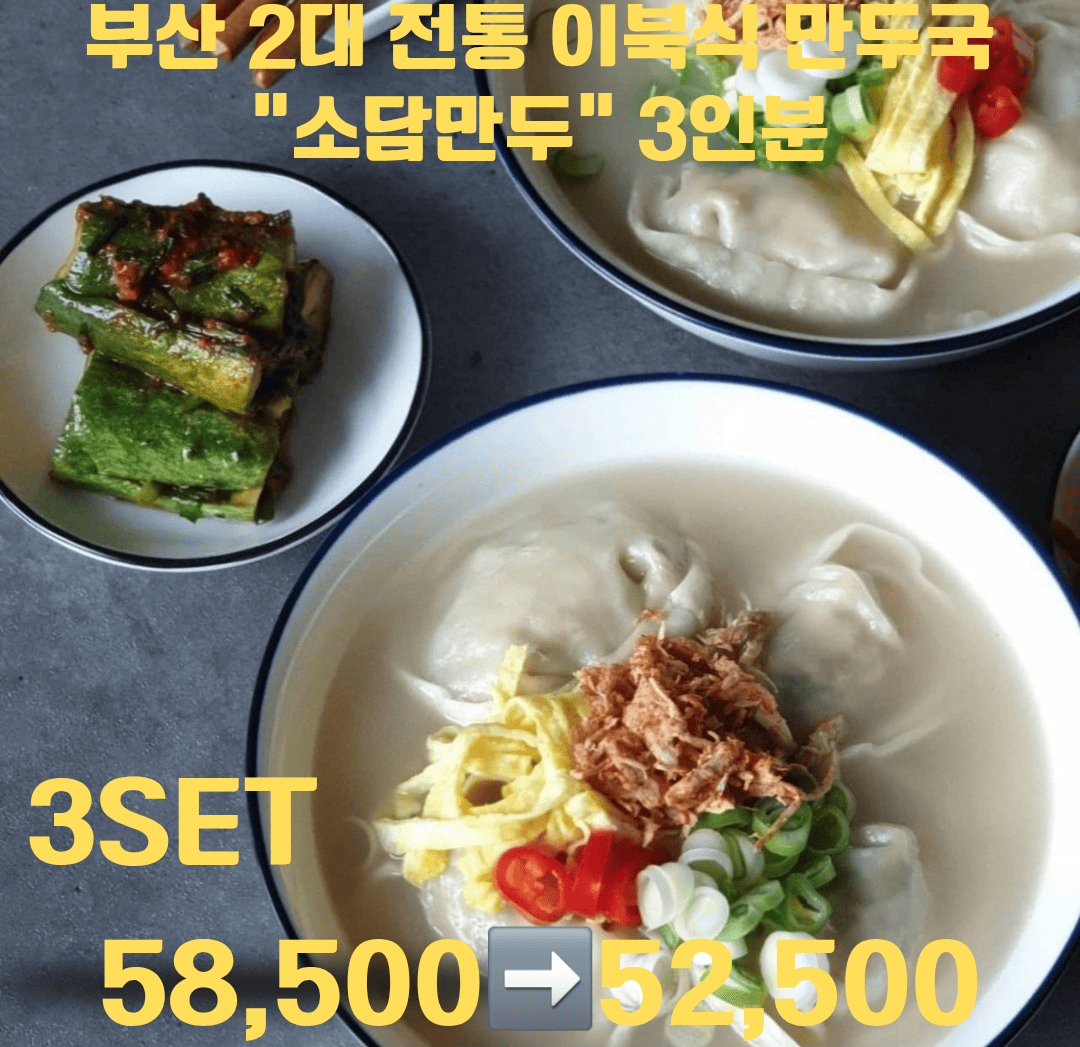 부산 명물 2대 전통 이북식 만두국 100% 수제만두 한돈 생왕만두 12알, 비법육수 3팩, 닭고명1통, 다대기 양념장 1통 (냉동X 생만두O) 3인분 3set 58,500>>52,500