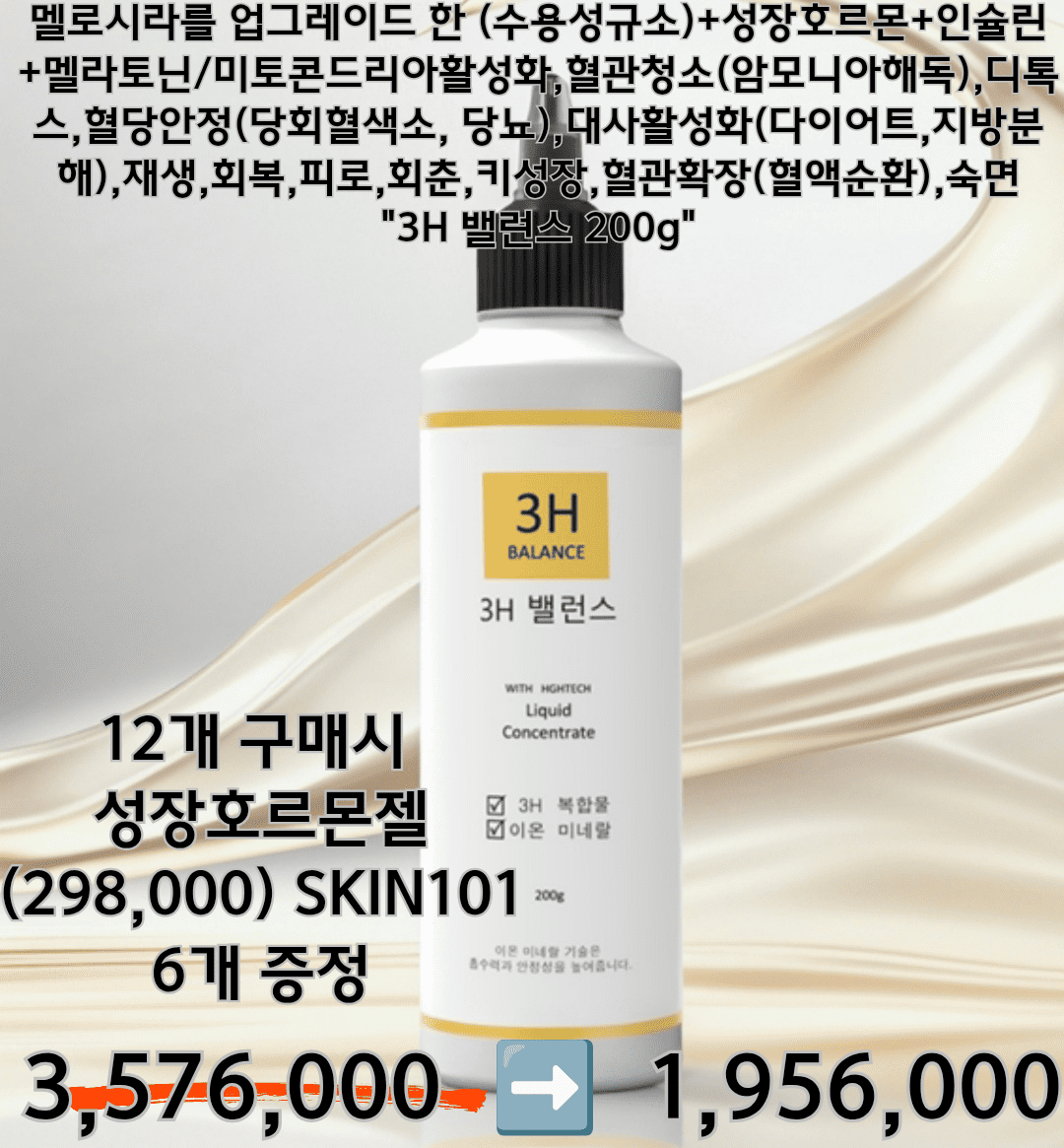 - HOME >eloommall >health > 멜로시라를 업그레이드 한 수용성규소+성장호르몬+인슐린+멜라토닌/미토콘드리아활성화혈관청소(암모니아해독),디톡스,혈당안정(당회혈색소, 당뇨),대사활성화(다이어트,지방분해),재생,회복,피로,회춘,키성장,혈관확장(혈액순환),숙면 "3H밸런스200g" 298,000>>168,0