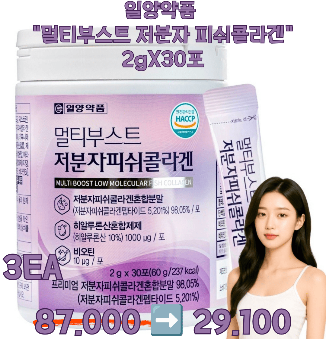 일양약품 "멀티부스트 저분자 피쉬콜라겐 2g×30포" 3box 87,000>>29,100